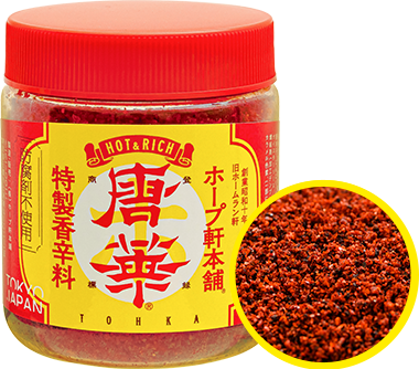 1970年頃、タイの留学生が、唐辛子とグラニュー糖をラーメンに入れて食べているのを見て試してみたのが唐華発想の始まり。グラニュー糖を抜くと辛さはあれどコクが無く、様々な材料を試す中で、牡蠣油を入れたところ、コクもあり辛味もまろやかに。その後、防腐剤不使用で安心な製品として完成した唐華。提供は店舗卓上だけでしたが、購入したいという沢山の嬉しいお声をいただき、1984年から店頭販売しています。